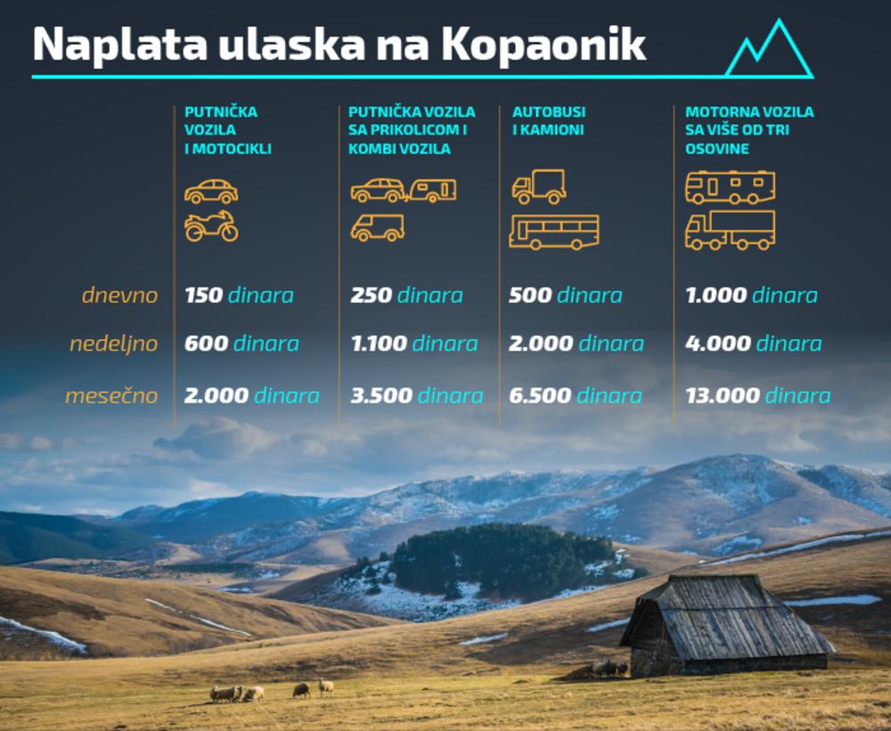 Građani opštine Raška i Brus koji žele na Kopaonik plaćaće godišnju ulaznicu i to za putnička vozila i motore u iznosu od 250 dinara, vlasnici putničkih vozila sa prikolicom i kombi vozila moraće da izdvoje 500 dinara, autobusi i kamoioni 1.000 dinara, a motorna vozila sa više od tri osovina 1.500 dinara.