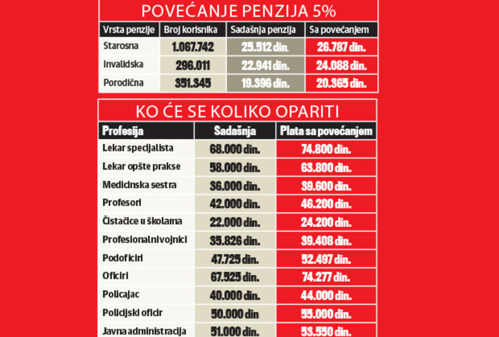 Sa ovim povećanjem plata lekara specijaliste biće veća u proseku za 6.800 dinara, profesora i nastavnika za 4.200, oficiri će dobijati 6.700 dinara više, vojnici 3.500, a policajci 4.000 dinara. Najvećem broju penzionera će penzioni ček u proseku biti veći za 1.190 dinara.