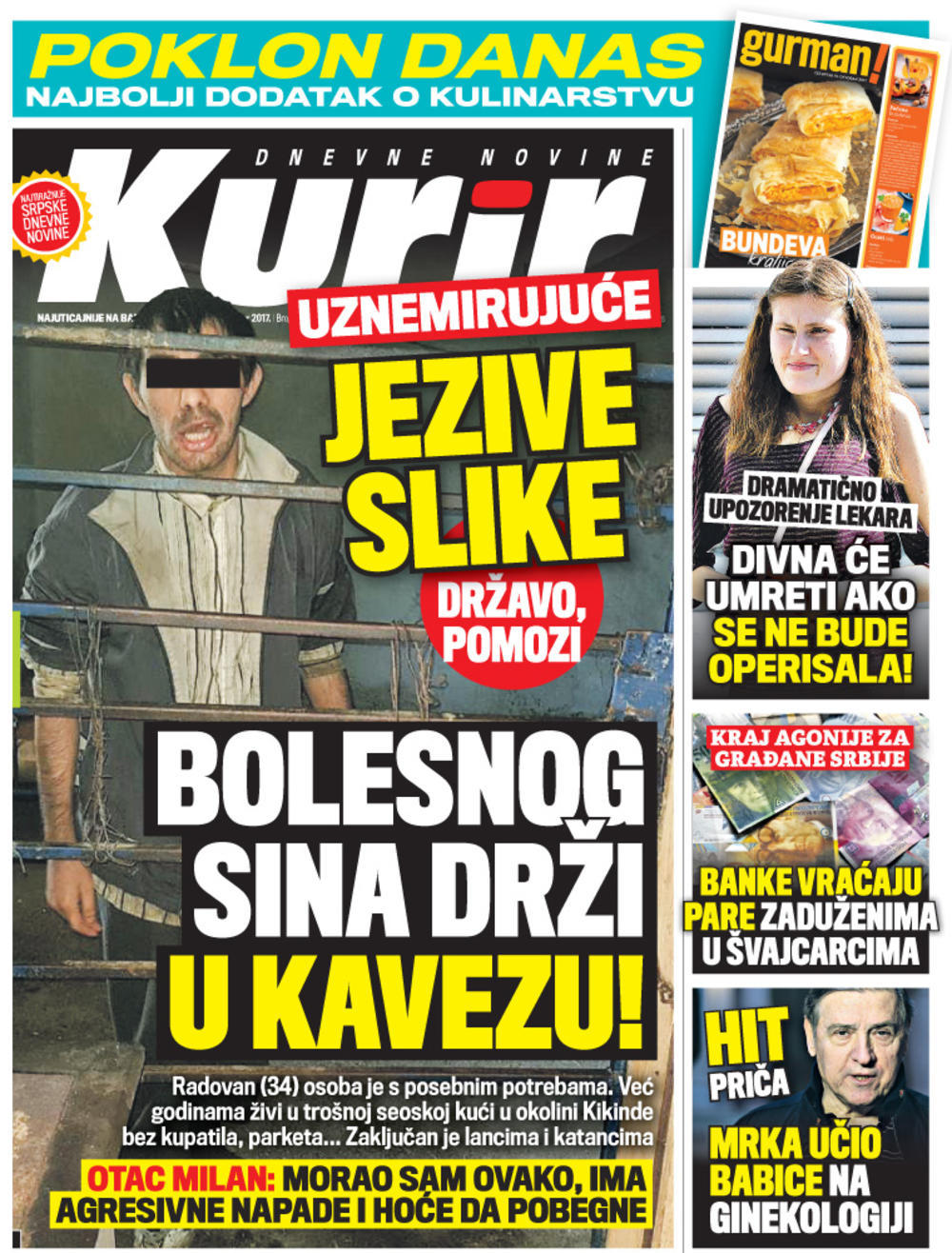 Kako je moguće da u 21. veku usred Srbije osoba zaostala u razvoju živi u kavezu u uslovima nedostojnim čoveka, zašto se njegov otac odlučio na ovakav potez, šta na sve to kažu u Centru za socijalni rad, zbog koje odluke Ministarstva zdravlja on ne može da bude smešten u psihijatrijsku ustanovu i na koji način se može pomoći ovom nesrećnom čoveku ČITAJTE U KURIRU.