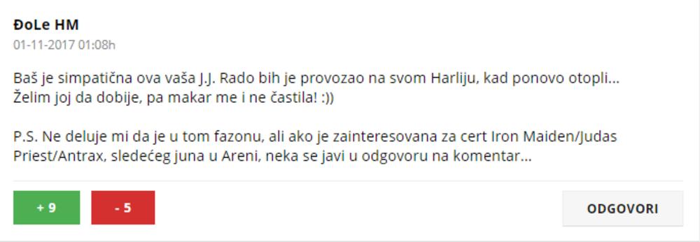 - Baš mi je simpatična ova vaša J.J. Rado bih je provozao na svom Harliju, kad ponovo otopli... Želim joj da dobije, pa makar me i ne častila. P.S. Ne deluje mi da je u tom fazonu, ali ako je zainetresovana za koncert Iron Maiden/Judas Priest/Antrax, sledećeg juna u Areni, neka se javi u odgovoru na komentar.