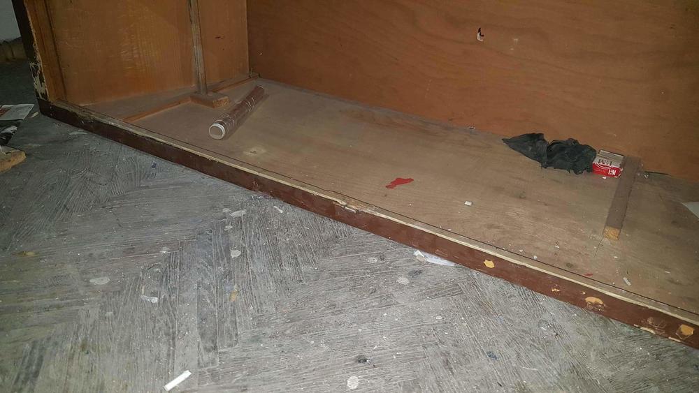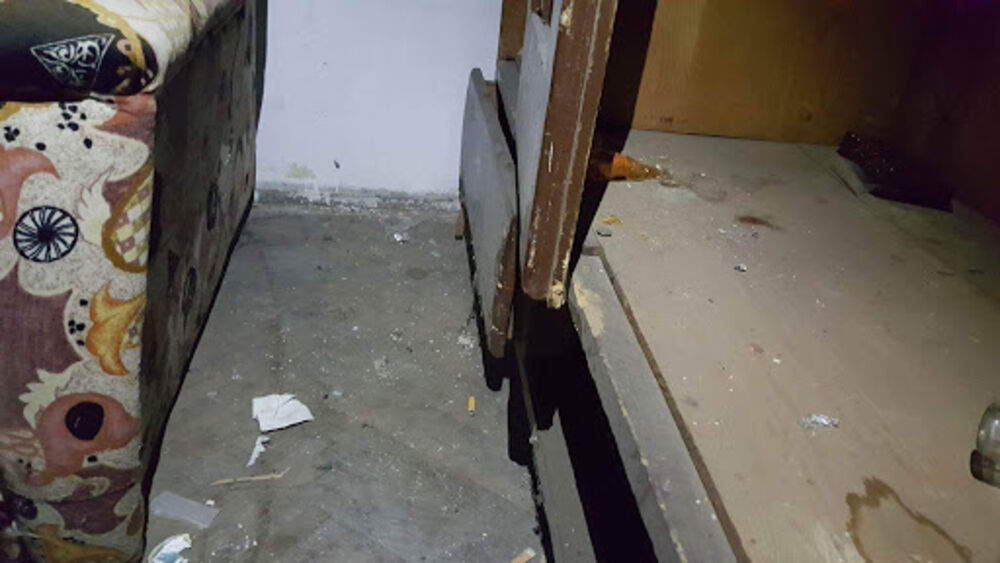 Po podu su razbacani razni predmeti, ostaci hrane, stare pakle cigareta, kondomi, špricevi...