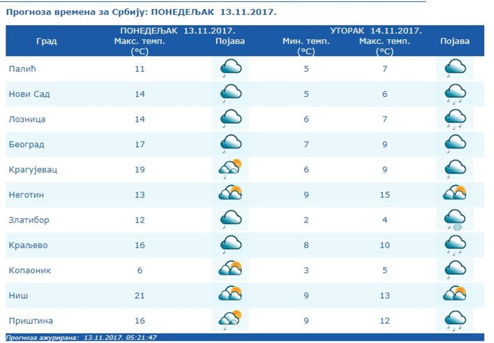 I u Beogradu će danas biti umereno do potpuno oblačno i vetrovito, povremeno s kišom, uz umeren i jak vetar tokom prepodneva. Najniža temperatura biće oko 13, a najviša dnevna oko 17 stepeni. Sutra će temperature biti znatno niže u celoj državi, tako da će maksimalna temperatura u Beogradu biti 9 stepeni, a na Kopaoniku samo 5.