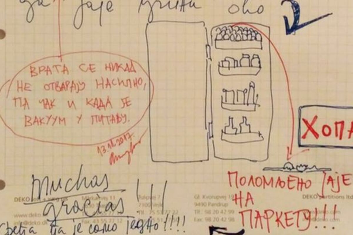 - Zahvaljujući tvom ingenioznom izumu zvanom "naređaću 150 jaja jedno na drugo" a zbog vakuuma koji postoji u vratima frižidera, imali smo noćas situaciju da otvorim nasilno vrata frižidera a da jaje učini ovo. I sreća pa je samo jedno! - napisala je jezgrovito ova supruga.