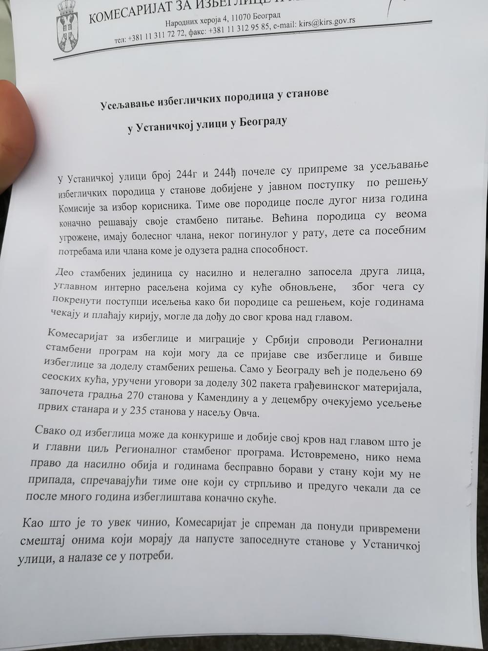 Komesarijat za izbeglice i migracije Srbije saopštio je danas da su pokrenuti postupci iseljenja izbeglica i raseljnih koji su se bespravno uselili u stanove u Ustaničkoj ulici u Beogradu, kako bi u te stanove bili useljeni oni koji su ih dobili u javnom postupku. U saopštenju Komesarijat je naveo da je spreman da ponudi privremeni smeštaj onima "koji moraju da napuste zaposednute stanove u Ustaničkoj ulici", kao i da su u Ustaničkoj ulici 244g i 244dj počele pripreme za useljavanje izbegličkih porodica u stanove dobijene u javnom postupku po rešenju Komisije za izbor korisnika. Dodaje se da su deo stambenih jedinica nasilno i nelegalno zaposela druga lica, uglavnom interno raseljena kojima su kuće obnovljene, zbog čega su pokrenuti postupci iseljenja kako bi porodice sa rešenjem, koje godinama čekaju i plaćaju kiriju, mogle da dodju do stana. Komesarijat je naveo da sprovodi Regionalni stambeni program na koji mogu da se prijave sve izbeglice i bivše izbeglice za dodelu stambenih rešenja. Navodi se da je u Beogradu već podeljeno 69 seoskih kuća, uručeni ugovori za dodelu 302 paketa gradjevinskog materijala, započeta gradnja 270 stanova u Kamendinu a u decembru treba da budu useljeni prvi stanari i u 235 stanova u naselju Ovča. ; "Svako od izbeglica može da konkuriše i dobije svoj krov nad glavom što je i glavni cilj Regionalnog stambenog programa. Istovremeno, niko nema pravo da nasilno obija i godinama bespravno boravi u stanu koji mu ne pripada, sprečavajući time one koji su strpljivo i predugo čekali da se posle mnogo godina izbeglištava konačno skuće", piše u saopštenju. ; Organizacija Krov nad glavom saopštila je u subotu da je 20 izbegličkih porodica koje žive u Ustaničkoj 244g dobilo rešenja o prinudnom iseljenju i da su od 27. do 30. novembra zakazana četiri iseljenja.