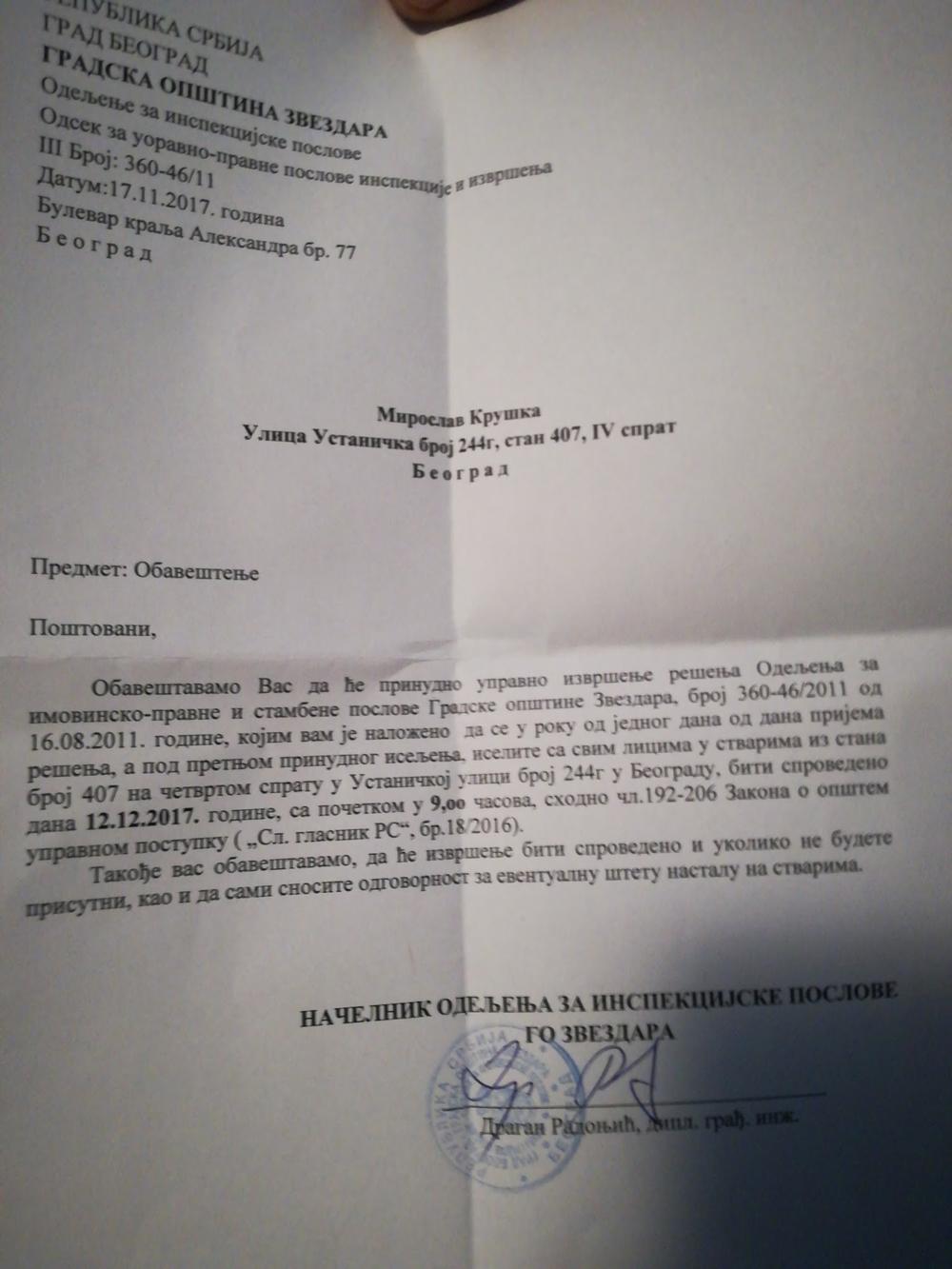 11:25 - Upravo je Kruški Miroslavu, koji je izbegao iz Hrvatske, stiglo da će takođe biti iseljen 12. decembra.