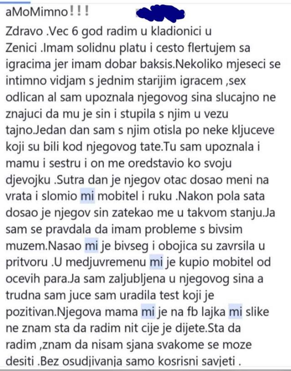 Zdravo. Već 6 godina radim u kladionici i Zenici. Imam solidnu platu i često flertujem sa igračima jer imam dobar bakšiš. Nekoliko meseci se intimno viđam sa jednim starijim igračem, seks odlčan, ali sam upoznala njegovog sina slučajno ne znajući da mu je sin i stupila s njim u vezu tajno. Jedan dan sam s njim otišla po neke ključeve koji su bili kod njegovog tate. Tu sam upoznala i mamu i sestru i on me je predsetvaio kao svoju devojku. Sutradan je njegov otac došao meni na vrata i slomio mi mobitel i ruku. Nakon pola sata došao je njegov sin i zatekao me u takvom stanju. Ja sam se pravdala da imam probleme s bivšim mužem. Našao mi je bivšeg i obojica su završila u pritvoru. U međuvremenu mi je kupio mobitel od očevih para. Ja sam zaljubljena u njegovog sina, a trudna sam. juče sam uradila test koji je pozitivan. Njegova mama mi na Fejsbuku lajkuje slike, ne znam šta da radim, znam da nisam sjajna, svakome se može desiti. Bez osuđivanja, samo korisni saveti, napisala je ova žena koja se očigledno nalazi u velikom problemu.