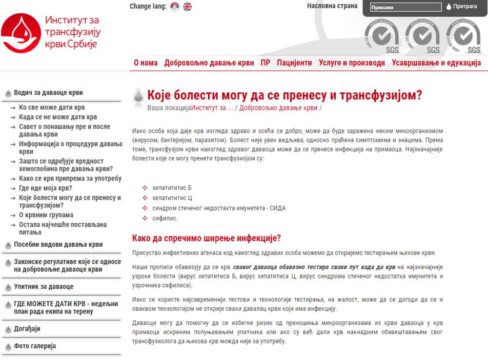 - Iako se koriste najsavremeniji testovi i tehnologije testiranja, na žalost, može da se dogodi da se i ovakvom tehnologijom ne otkrije svaki davalac krvi koji ima infekciju - piše na sajtu Instituta za transfuziju krvi Srbije.