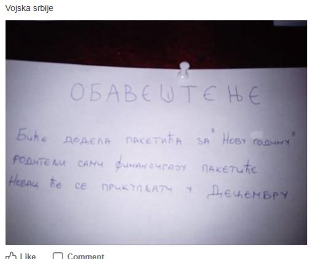 Na Fejsbuku je jedan korisnik ove društvene mreže podelio fotografiju obaveštenja koja je mnoge zbunila. Naime, kako piše na obaveštenju okačenom na oglasnoj tabli, i to kako tvrdi korisnik u Vojsci Srbije, roditelji sami finansiraju paketiće?!