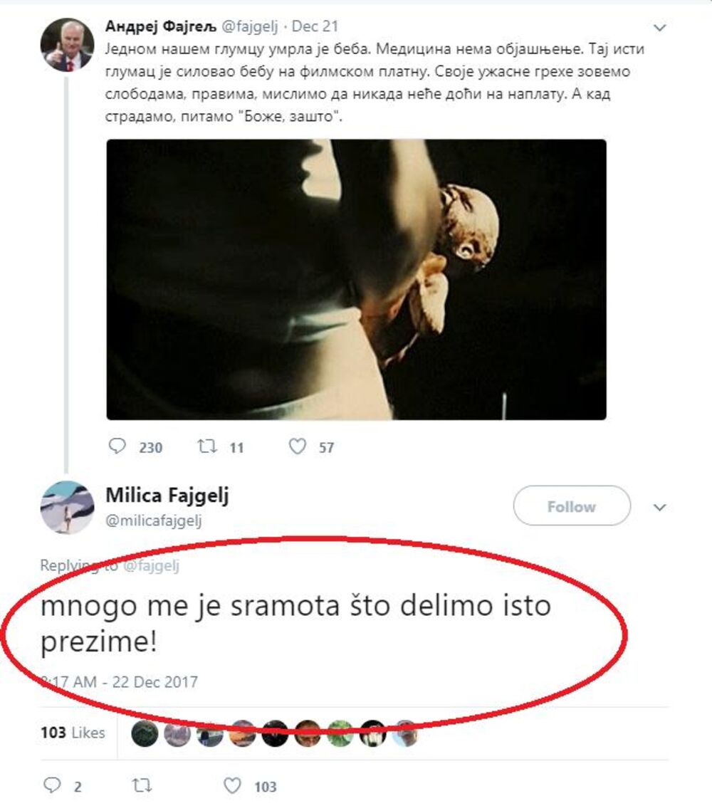 U komentarima ispod njegovog tvita Milica Fajgelj napisala je: