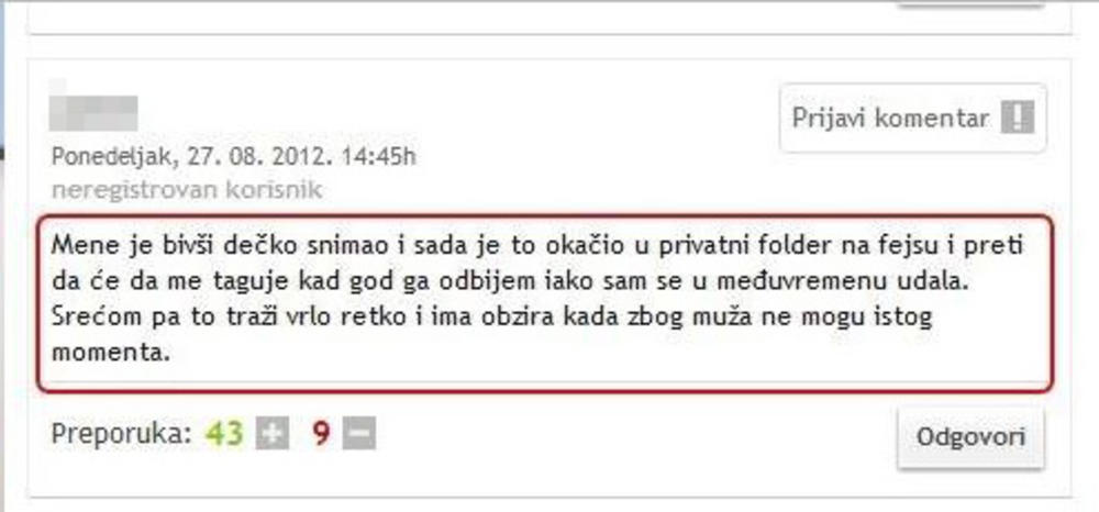 Ova Srpkinja napisala je da je bivši dečko snimao tokom njihove veze i da je sada te fotografije okačio na Fejsbuk. Ona se u međuvremenu udala, ali je bivši partner ucenjuje i preti joj da će je tagovati na fotografijama ukoliko mu "ne da".