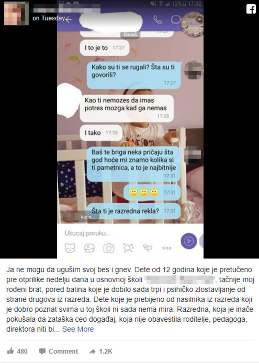 "Ja ne mogu da ugušim svoj bes i gnev. Dete od 12 godina koje je pretučeno pre otprilike nedelju dana u osnovnoj školi "***********", tačnije moj rođeni brat, pored batina koje je dobilo sada trpi i psihičko zlostavljanje od strane drugova iz razreda. Dete koje je prebijeno od nasilnika iz razreda koji je dobro poznat svima u toj školi ni sada nema mira. Razredna, koja je inače pokušala da zataška ceo događaj, koja nije obavestila roditelje, pedagoga, direktora niti bilo koga u toj školi sa slučajem, koliko znam ima dvoje dece! Razredna koja mu je rekla da ne cmizdri kao neka devojčica, da ode u wc da se umije i da ode na sledeći čas ima dvoje dece... Majka. To je nekome majka, roditelj. Pedagogica je bila u šoku kada smo otišli posle par dana od događaja u školu. Pedagogica, koja je na kraju našeg razgovora rekla da su oni drugari i da ih moramo pomiriti. To je rekla nama, majci čije dete ima masnice po rukama i nogama. Čije dete je bačeno na pod i udarilo glavom o isti, i sutradan ujutru povraćalo zbog potresa mozga! Dete koje je pretrpelo ozbiljne psihičke traume treba da se pomiri sa svojim drugarom koji ga vuče, gura, štipa od prvog razreda! Tom detetu se danas rugaju drugovi iz razreda jer je pretučeno. Ti drugovi koji su navijali u svlačionici dok je moj brat dobijao batine!!! To nisu deca, to su male psihopate koje će Bog zna šta biti kada odrastu. Muka mi je dok ovo pišem, od besa se tresem! Muka mi je jer sutra može biti vaše dete, vaš brat, sestra. To je jedno malo dete koje ničim na ovom svetu nije moglo da zasluži da dobije batine!!! Molim sve moje prijatelje da ovo podele u što većem broju, da bi bar od sramote, ako ni od čega drugog, počev od razredne do direktora iz te škole bilo ko odreagovao."