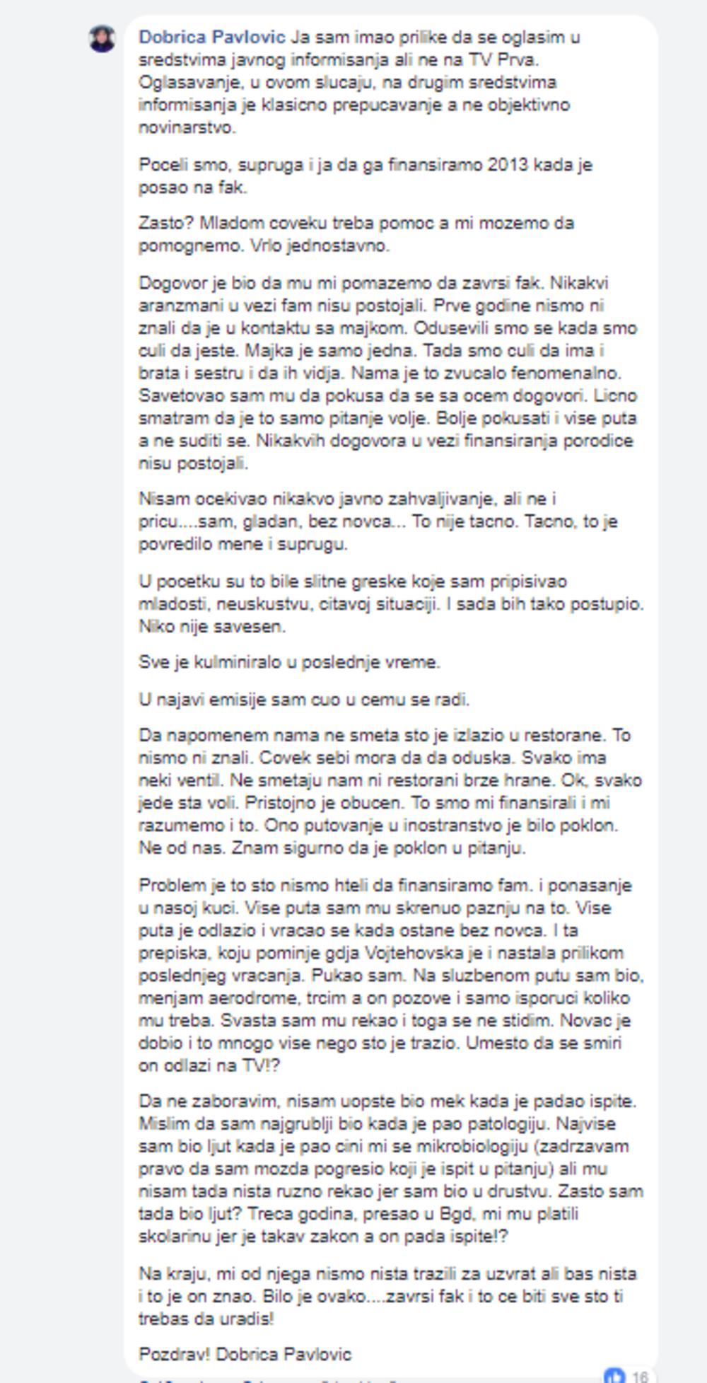 - Da napomenem nama ne smeta što je izlazio u restorane. To nismo ni znali. Čovek sebi mora da da oduška. Svako ima neki ventil. Ne smetaju nam ni restorani brze hrane. Ok, svako jede šta voli. Pristojno je obučen. To smo mi finansirali i mi razumemo i to. Ono putovanje u inostranstvo je bilo poklon. Ne od nas. Znam sigurno da je poklon u pitanju - piše on i ponavlja da je problem između njih nastao jer Pavlovići nisu hteli da finansiraju Milanovu porodicu, kao ni njegovo ponašanje u njihovom domu.