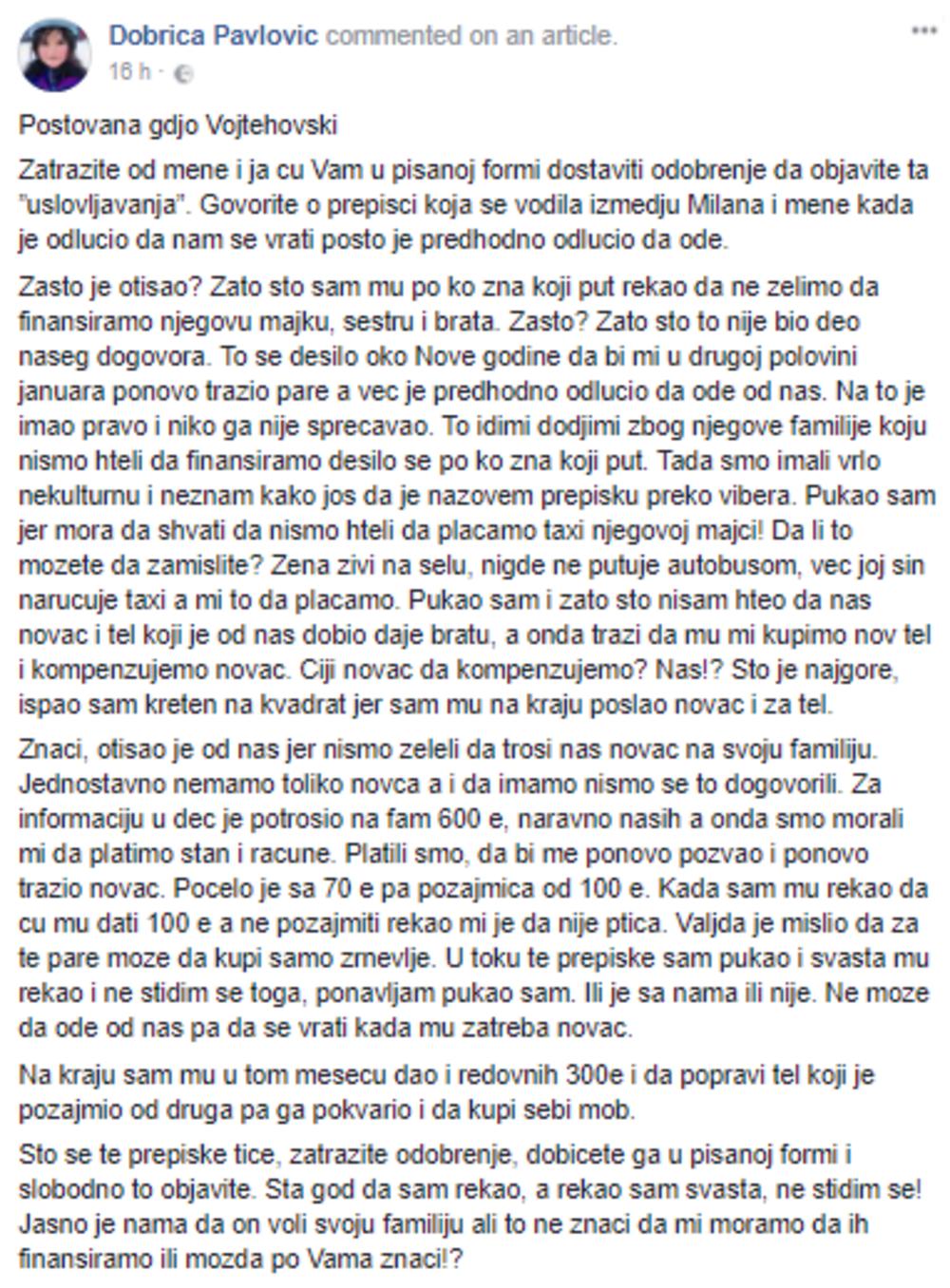 - U toku te prepiske sam pukao i svasta mu rekao i ne stidim se toga, ponavljam pukao sam. Ili je sa nama ili nije. Ne može da ode od nas pa da se vrati kada mu zatreba novac! - napisao je izrevoltirani čovek i doda da mu je na kraju meseca dao i redovnih 300 evra i da popravi telefon koji je pozajmio od druga pa ga pokvario, a potom se obratio Vojtehovskoj: