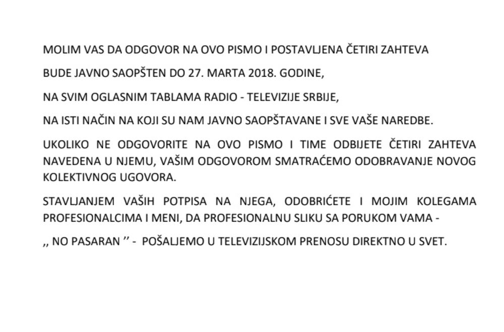 Kako nam je ispričao, pismo je namenjeno isključivo promeni, kako kaže, nakaradnog, višegodišnjeg sistema upravljanja i odlučivanja na RTS i uspostavljanju i utemeljivanju modernih, profesionalnih, kreativnih i radnih standarda svih profesija u ovoj medijskoj kući, a ne smeni rukovodstva!