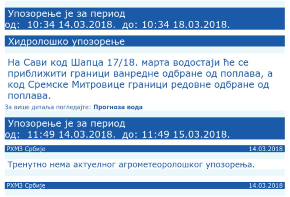 Zato je i RHMZ izdao upozorenje da će na Savi kod Šapca 17. ili 18. marta približiti granici vanredne odbrane od poplava, a da će kod Sremske Mitrovice granica redovne odbrane od poplava, što je prvi nivo upozorenja, biti dostignuta 17, odnoso 18. marta sa tendencijom daljeg rasta.