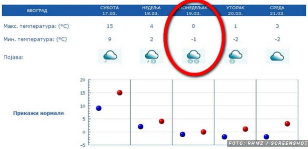 Meteorolozi za ponedeljak najavljuju jače snežne padavine i temperaturu između minus jedan i nula stepeni. A prve pahulje moguće su već u nedelju u kasnim poslepodnevnim časovima.