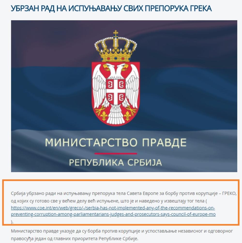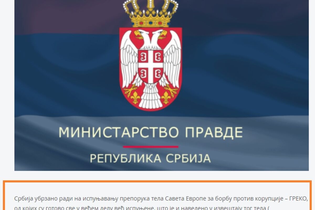 Ispunjavanje preporuka GREKA predstavlja proces u kome kontinuirano učestvuju svi državni organi na koje se taj proces odnosi (Narodna skupština Srbije, Ministarstvo pravde, Ministarstvo finansija, Visoki savet sudstva, Državno veće tužilaca, Agencija za borbu protiv korupcije)" - piše u vesti ovog ministarstva, i navode se koraci ka tom cilju, ali se gotovo nigde ne pominje nezadovoljstvo koje je EU telo iskazalo stanjem u Srbiji.