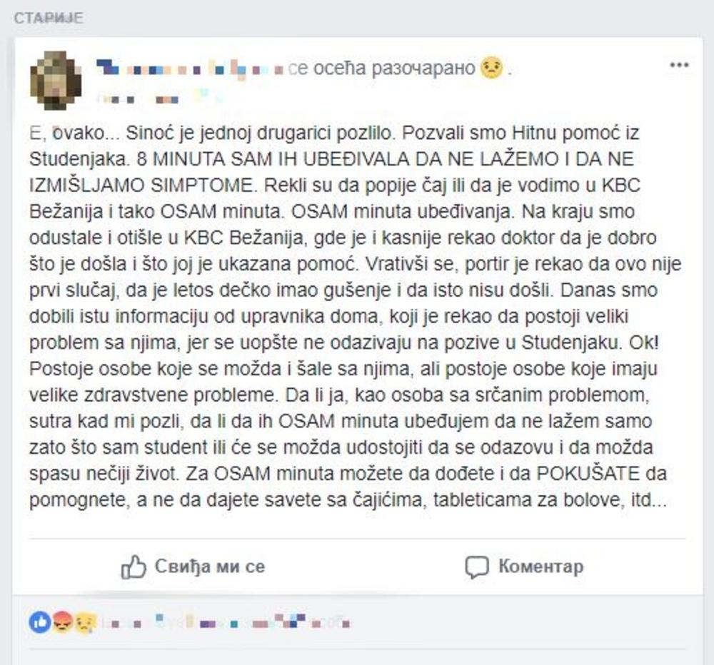 Naime, devojka koja se trenutno nalazi u Studentskom domu tvrdi kako je njenoj drugarici pozlilo, a da se Hitna pomoć nije odazvala. Upravo suprotno, kaže kako se "ubeđivala" sa njima osam minuta nakon čega su je optužili da izmišlja simptome.