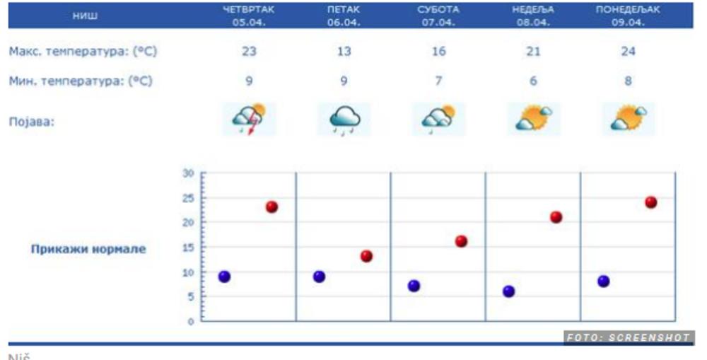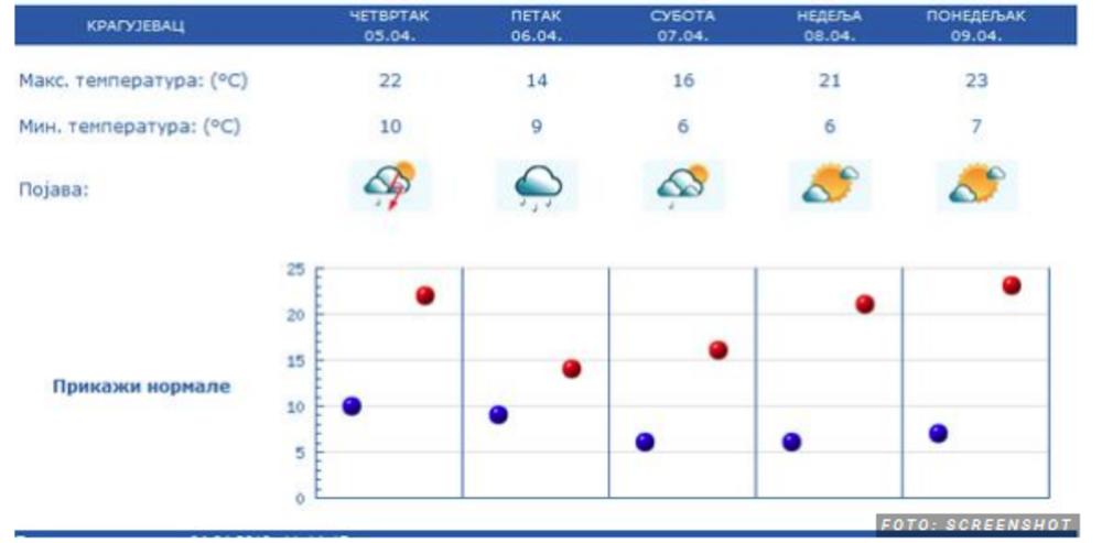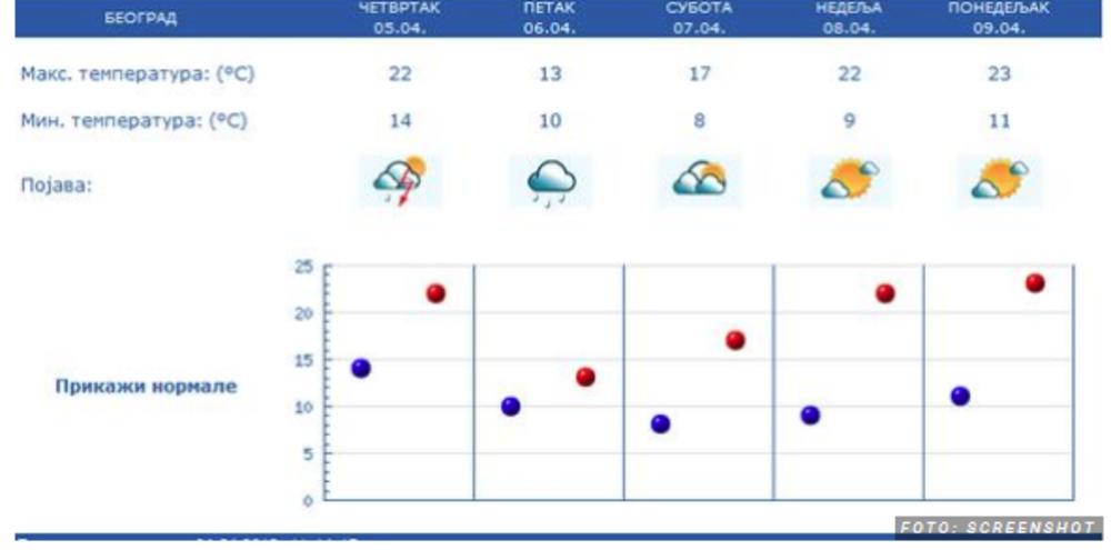 - Ujutru i pre podne iznad većeg dela zemlje biće pretežno sunčano, samo na jugoistoku umereno oblačno. Naoblačenje mestimično sa kišom, pljuskovima sa grmljavinom koje će sredinom dana zhavatiti severne i zapadne krajeve do kraja dana će se proširiti na celu zemlju. Duvaće slab vetar. Najniža temperatura biće od 6 do 12, a najviša od 18 do 23 stepena Celzijusa - najavljuje Todorović.