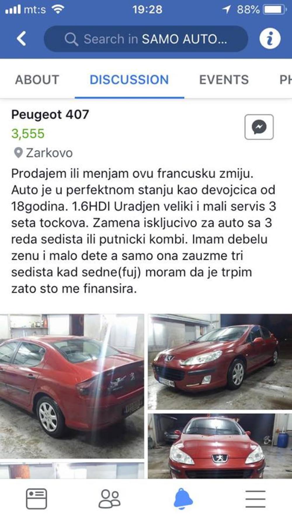 Fejsbukom od jutros kruži oglas za prodaju jedne "francuske zmije". U pitanju je Peugeot 407.