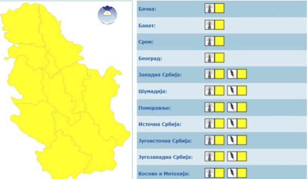 U celoj zemlji na snazi je žuti meteoalarm, upozoravaju u Republičkom hidrometeorološkom zavodu. Upozorenje se odnosi na visoke temperature za ovo doba godine, ali i zbog grmljavina koje se očekuju u nekim delovima zemlje. Poseban oprez potreban je i zbog visokog UV zračenja!
