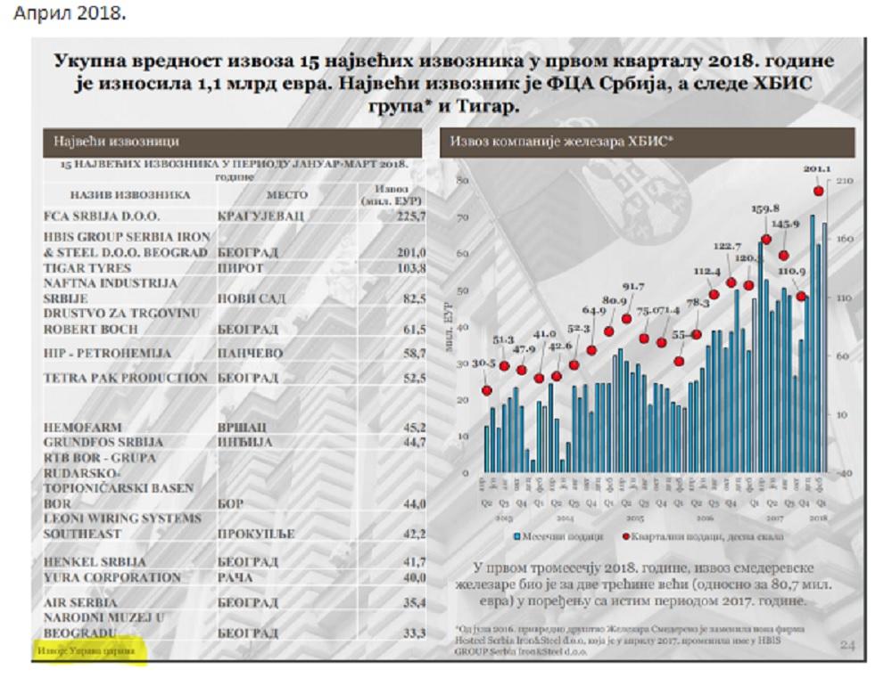 Takođe, naglašeno je da statistika spoljne trgovine ne daje podatke o firmama koje učestvuju u spoljnotrgovinskoj razmeni roba, jer se oni tretiraju kao individualni podaci. Na sledećim linkovima se nalaze izveštaji Ministarstva finansija - Tekuća makroekonomska kretanja, objavljeni u aprilu i maju 2018, i u njima se, kao izvor podataka navodi Uprava carina.
