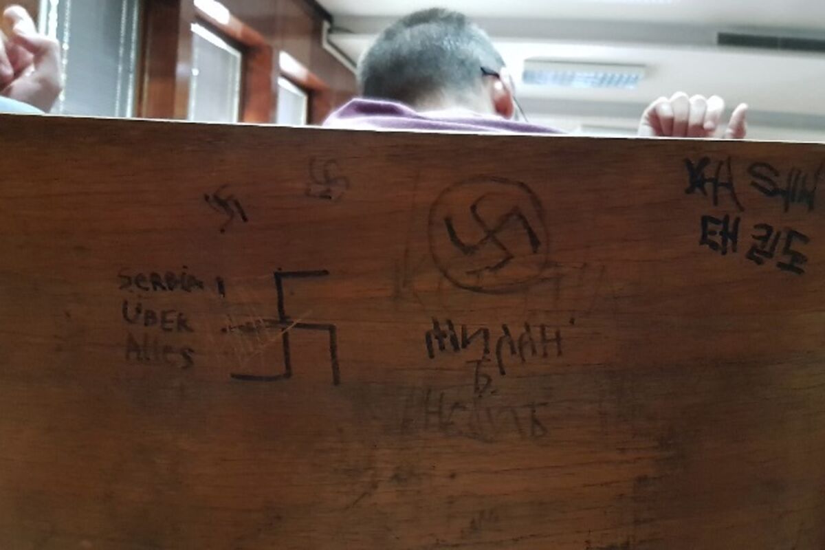 Kukasti krst i natpis "Milan Nedić" ispisani su na sedištu u amfiteatru Fakulteta političkih nauka u Beogradu.