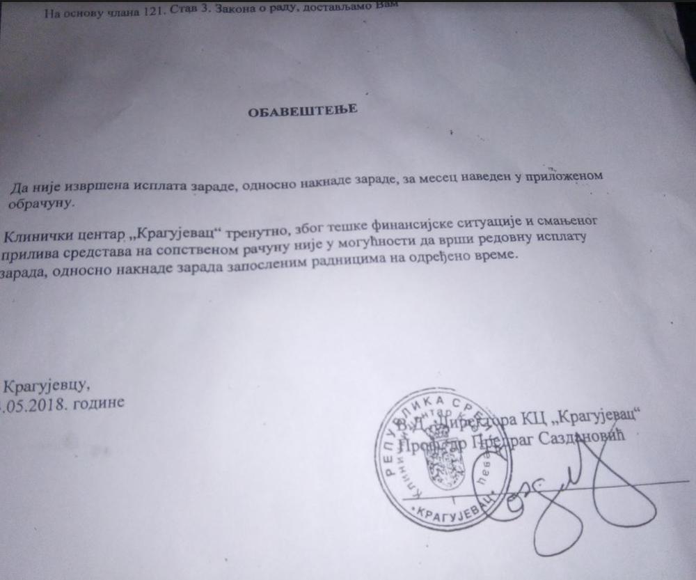 Espresu je stiglo i saopštenje Kliničkog centra Kragujevac koje je dobio jedan od radnika, zaposlen u vešeraju, a tiče se upravo kašnjenja plate.