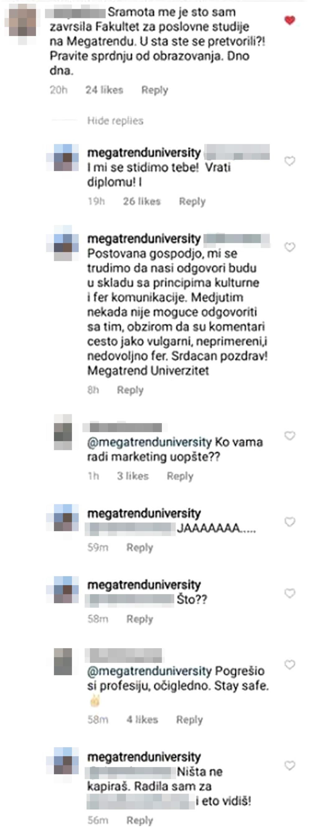 Lice zaduženo da govori u ime Megatrend univerziteta napisalo je: "I mi se stidimo tebe! Vrati diplomu".