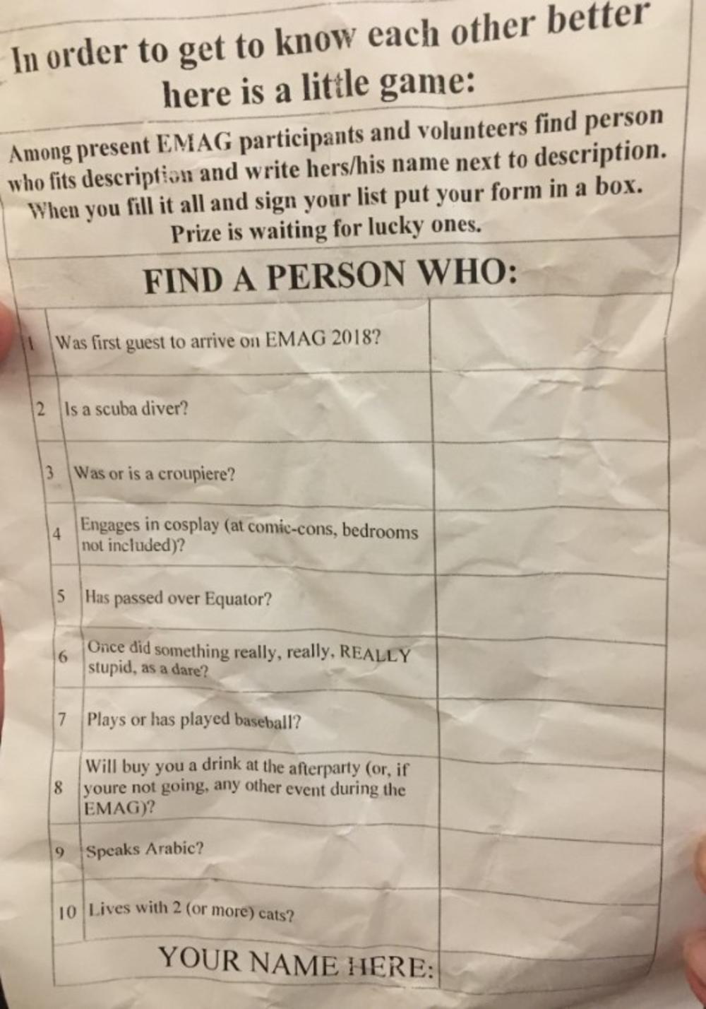 Da su ovi susreti, ali i zabave Mense uvek ispraćene nekim izazovom dokazuje i to da su svi posetioci Starog dvora sinoć dobili pitanja, na koja su trebali da daju odgovore, a ko najpre dođe do odgovora dobija i nagradu. Zanimljivo je i to što su ova pitanja koncipirana tako da sve učesnike potakne na međusobnu komunikaciju i upoznavanje, kao i razmenu ideja.