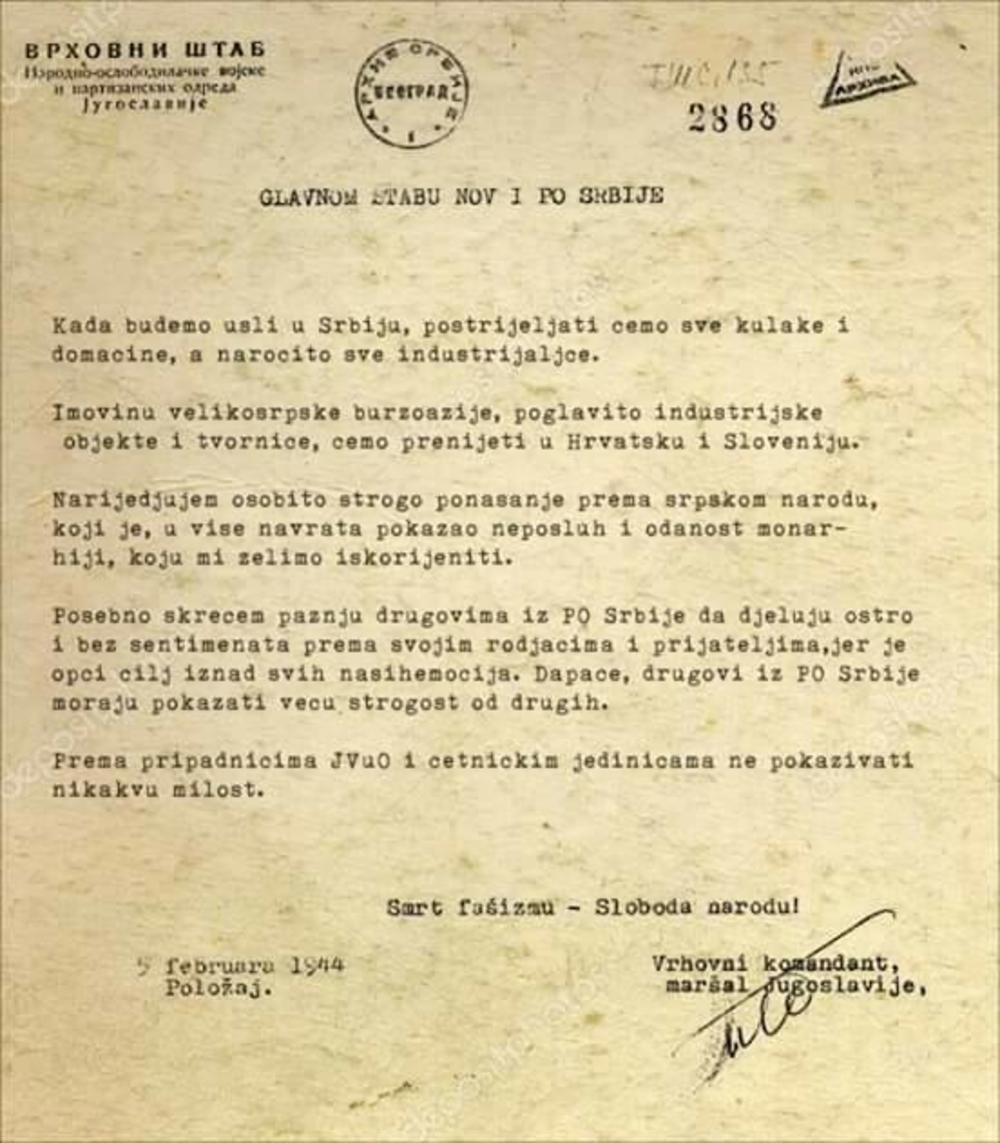 Dokument Arhiva Srbije u kome vrhovni komandant Narodnooslobodilačke vojske i partizanskih odreda Josip Broz Tito naređuje streljanje srpskih domaćina i selidbu industrijskih postrojenja, izazvao je žešću polemiku na društvenim mrežama. U ovom dokumentu navodno Tito naređuje da se prema delu srpskog naroda "naročito strogo postupa" jer izražava vernost monarhiji čiji su članovi tada bili u Londonu.