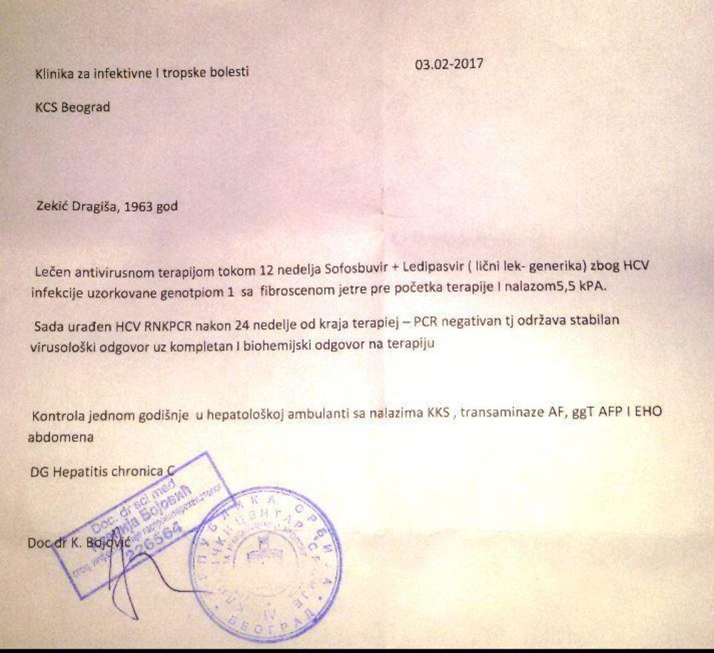 Ja sam se izlecio za 12 nedelja. Terapiju mi je ćerka nabavila iz Indije i Bangledaša. Moja najveće želja je da lek bude dostupan i u našoj zemlji. Drugi naziv za lek Harvoni koji u Americi košta 84.000 dolara, a u Evropi 40.000 evra, u Indiji je registrovan pod nazivom Ledifos i ima apsolutno iste sastojke, odnosno (Sofos Buvir 400mg+Ledipasvir od 100mg). Ovaj lek u Indiji koji kako kaže sadrži iste sastojke i košta 600 evra.
