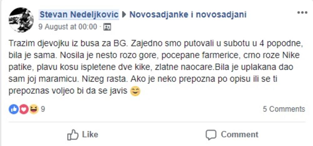 Naime, on je odlučio da potraži devojku koju je video u autobusu koji je išao za Beograd. Kako je napisao, zajedno su putovali, a ona je bila sama. Naveo je da je devojka nosila rože majicu, farmerke koje su bili pocepane, ali i patike marke "Nike".