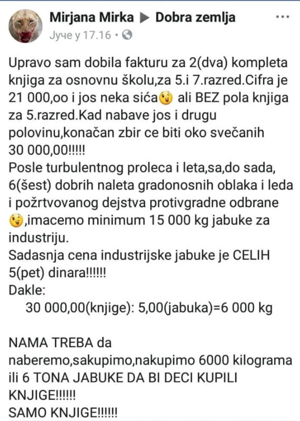 Naime, očajna žena je u Fejsbuk grupi "Dobra zemlja" napisala da će je dva kompleta za 5. i 7, razred koštati 30.000 dinara. Ona je dodala da je cena industrijske jabuke 5 dinara po komadu, te izračunala da joj je potrebno 6 tona jabuke da bi deci kupila knjige.