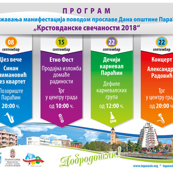 - Počev od Art festa na kome su ove godine gosti bili strane ambasade sa umetničkim i dokumentarnim izložbama, preko Međunarodnog šahovskog festivala koji nedelju dana u Paraćinu okuplja najbolje šahiste i goste iz celog sveta, pozorišnih predstava sa eminentnim glumcima kao što je Slobodan Ćustić, književnih večeri i izložbi, koncerata na otvorenom, projekcija filmova, tribina sa debatama, likovnih kolonija, Vinske promenade pa sve do Krstovdanskih svečanosti koje počinju Džez koncertom Sinana Alimanovića, nastavljaju se Etno festom - prodajnom izložbom narodne radinosti, Dečijim karnevalom sa više od 600 učesnika do koncerta Aleksandre Radović 22. septembra na trgu u centru grada - objašnjava on.