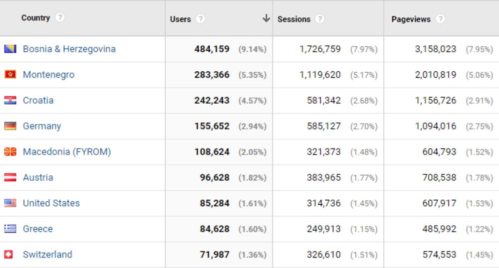Najbolji rezultat od pokretanja našeg i vašeg sajta u avgustu smo postigli u Crnoj Gori: prema podacima Gugl analitike, čak 283.366 građana Crne Gore čitalo nas je u ovom mesecu, a otvorili su više od 2 miliona stranica.
