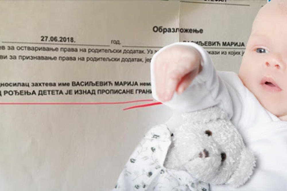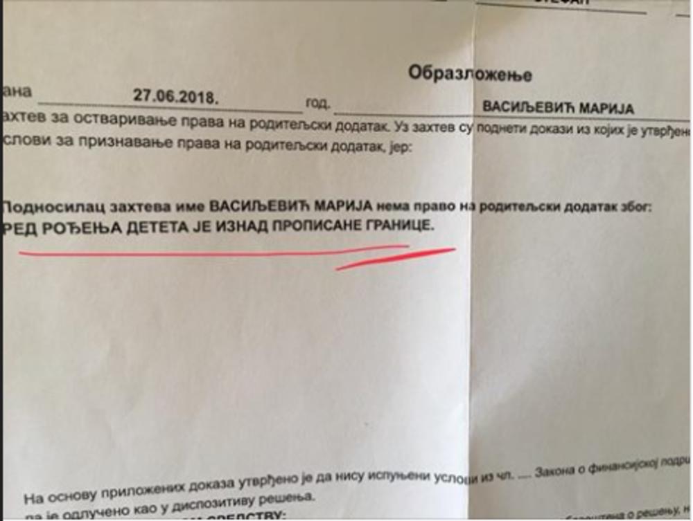 U njemu se navodi da podnosilac zahteva Vasiljević Marija nema pravo na roditeljski dodatak zbog toga što je "red rođenja deteta iznad propisane granice".