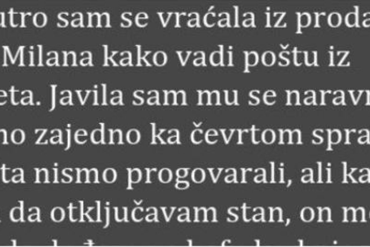 Zove se Milan i ima 29 godina. Nikoga nisam znala u toj zgradi osim njega, a nisam ni imala želju da upoznajem neke ljude. Jedno jutro sam se vraćala iz prodavnice i zatekla Milana kako vadi poštu iz sandučeta. Javila sam mu se naravno i pošli smo zajedno ka čevrtom spratu.