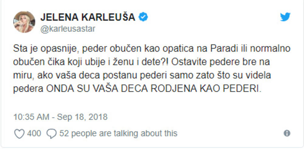 ŠTA JE OPASNIJE, PEDER OBUČEN KAO OPATICA NA PARADI ILI NORMALNO OBUČEN ČIKA KOJI UBIJE ŽENU I DETE? Karleuša opet gađa u metu! (FOTO)