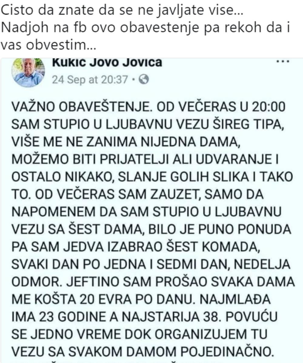 Gospodin Kukić Jovo Jovića je na društvenim mrežama rešio da stavi tačku na njegov "fleksibilan" ljubavni život. Naime, on je poslao "ozbiljno" obaveštenje u kojem se ograđuje od afera kroz koje je prolazio jer je konačno iako kao stariji gospodin, odlučio da se skrasi.