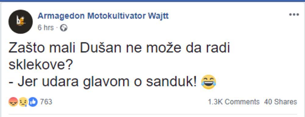 "Zašto mali Dušan ne može da radi sklekove? - Jer udara glavom o sanduk!"