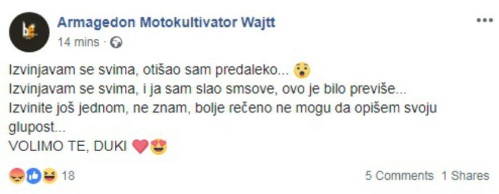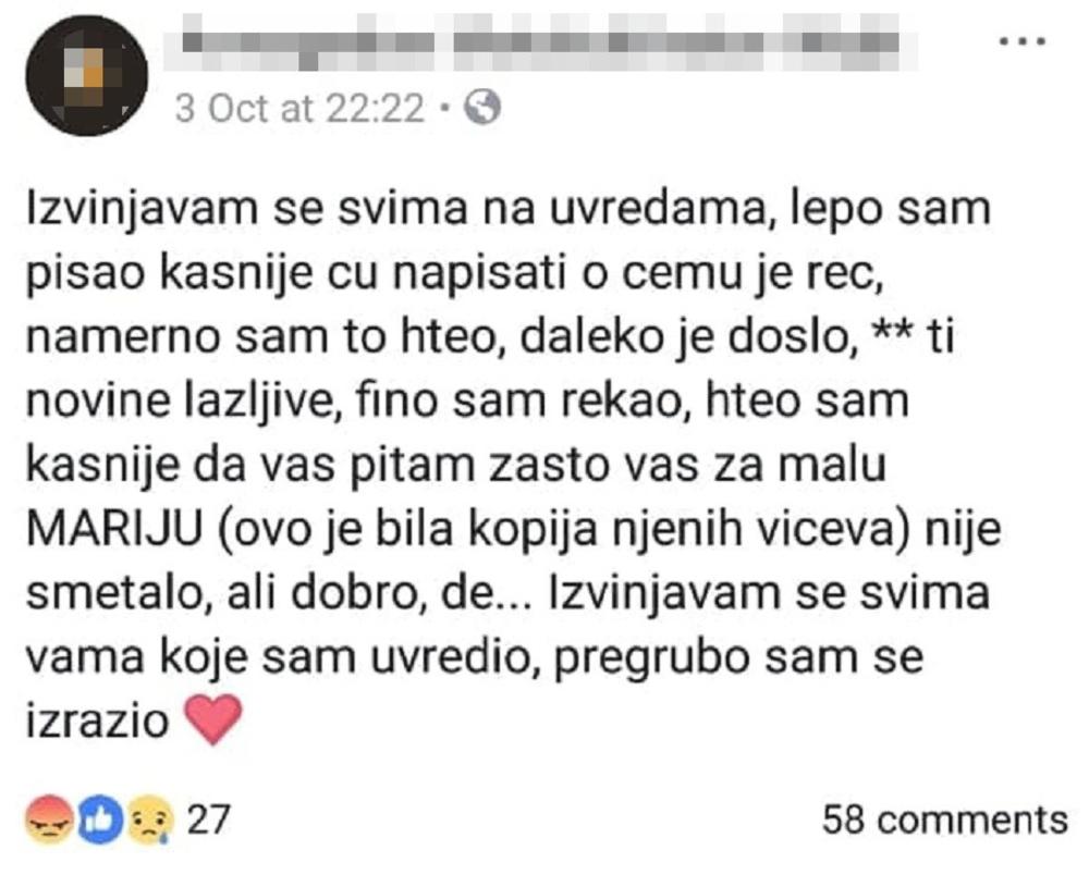- Izvinjavam se svima na uvredama, lepo sam pisao kasnije ću napisati o čemu je reč. Namerno sam to hteo, daleko je došlo, j***m ti novine lažljive. Fino sam rekao, hteo sam kasnije da vas pitam zašto vam za malu Mariju (ovo je bila kopija njenih viceva) nije smetalo, ali dobro... Izvinjavam se svima vama koje sam uvredio, pregrubo sam se izrazio - napisao je na svom Fejsbuk profilu.