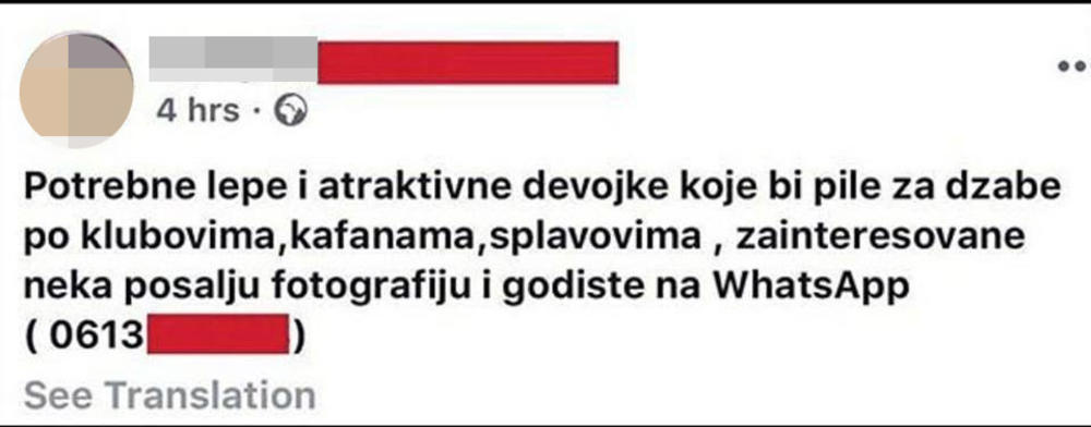 - Potrebne lepe i atraktivne devojke koje bi pile za džabe po klubovima, kafanama, splavovima, zainteresovane neka pošalju fotografije i godište na WhatsApp - napisala je devojka i ostavila broj telefona.