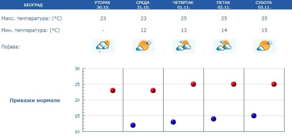 Izgledi vremena za sedam dana, do 6. novembra: Suvo i toplo sa temperaturom znatno iznad prosecnih vrednosti za ovo doba godine, od 22 do 27 C.
