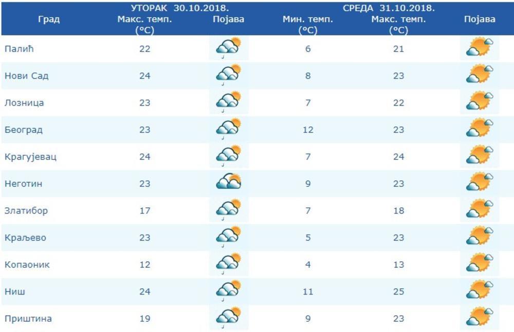Najniža temperatura od 10 na istoku do 19 stepeni na severozapadu i košavskom području, a najviša od 19 do 25 stepeni Celzijusovih!