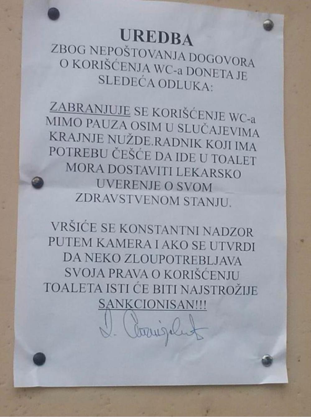 U jednoj kompaniji pojavio se skandalozno obaveštenje na oglasnoj ploči u kome se radnicima zabranjuje korištenje toaleta mimo pauza, osim u slučajevima krajnje nužde.