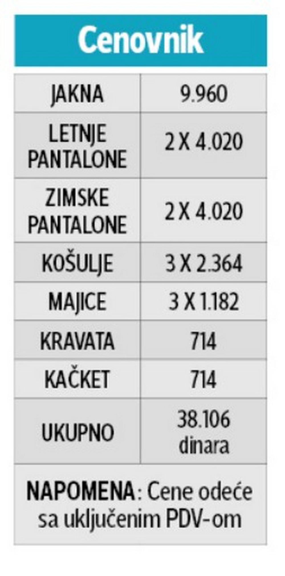 Svako od vozača će u svom kompletu zadužiti: jednu jaknu, po dvoje letnjih i zimskih pantalona, tri košulje, tri letnje majice, te kravatu i kačket. Najskuplja stavka na spisku je univerzalna, tamno plava jakna koja košta 9.960 dinara sa PDV-om, a istu cenu dele kravata i kačket koji su najjeftiniji i koštaju po 714 dinara sa PDV-om.ž