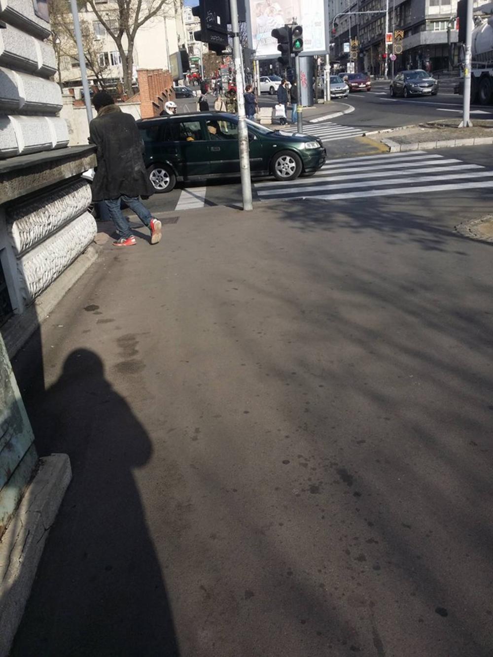 Na dojavu da misteriozni Afrikanac leži na simsu prizemlja zgrade u blizini Ministarstva finansija, u Ulici kneza Miloša, izašli smo na teren i zatekli ga kako sedi na stepeništu na ulazu građevine.