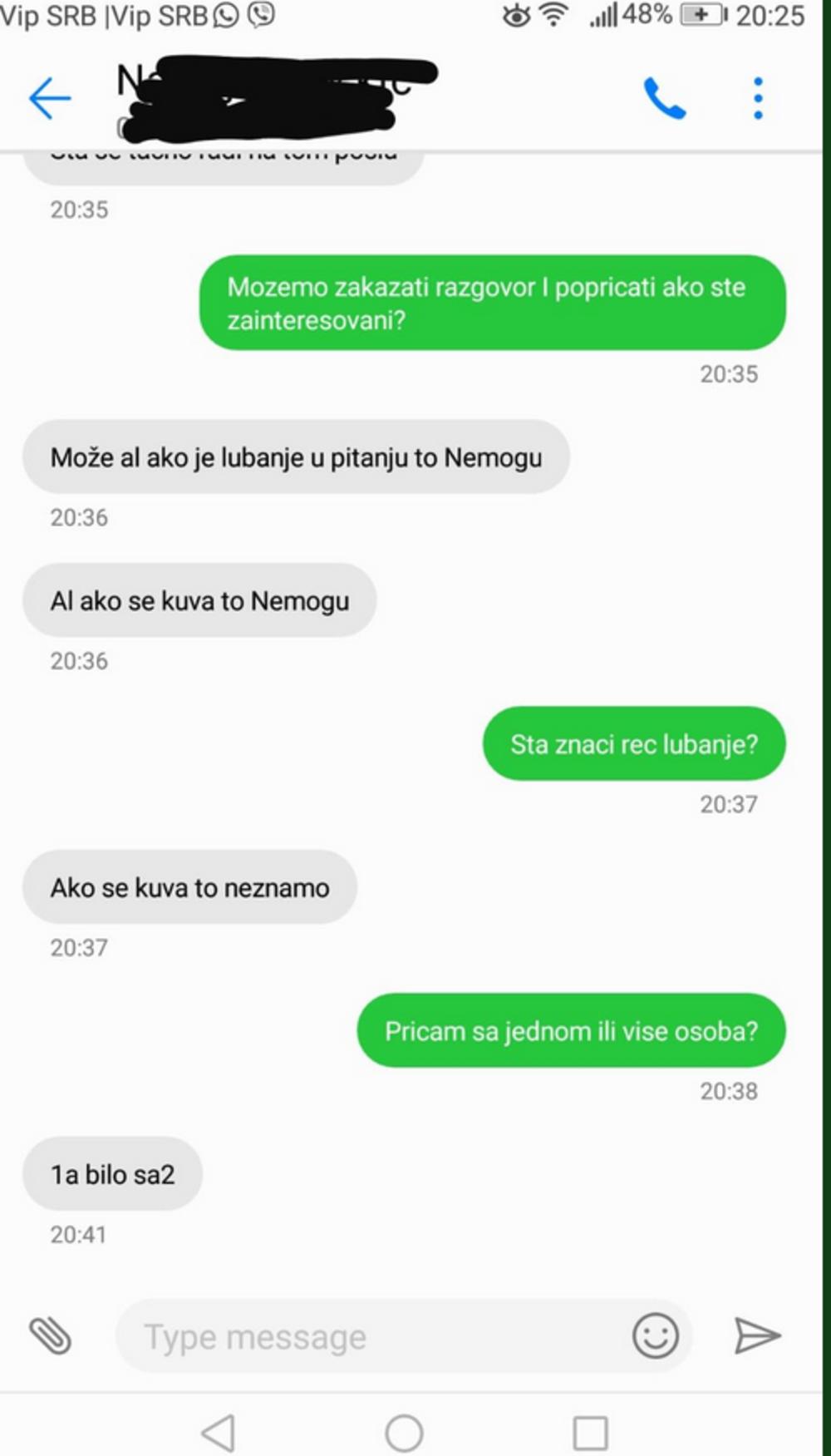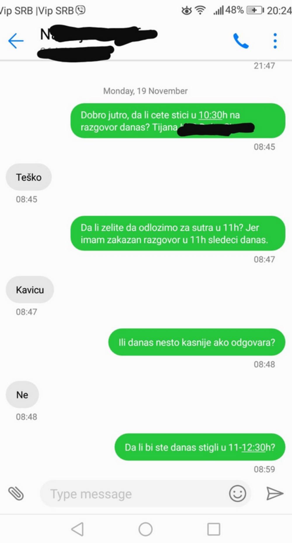 Kako je objasnila prijateljica žene koja je i vodila ovaj razgovor, kandidatkinja je studentkinja koja se javila na oglas za posao u ugostiteljstvu, obavila telefonski razgovor, a onda je usledilo ovo dopisivanje sa potencijalnim poslodavcem.