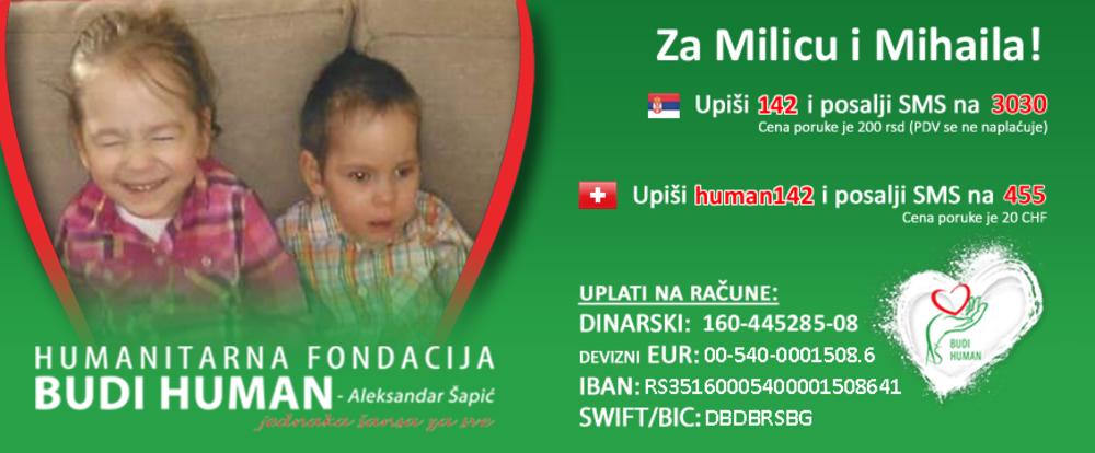 Milici i Mihailu možete pomoći putem SMS-a, tako što ćete upisati broj 142 i poslati na 3030. Takođe, malim borcima možete da pomognete i uplatom na dinarski ili devizni račun, kao i platnom karticom na linku e-doniraj koji možete naći na sajtu budihuman.rs.